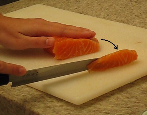 Ao término do corte, repare que o sashimi fica colado na ponta da faca. É aí que você consegue carregar a fatia até a borda da tábua e dar sequência aos demais cortes. Assim, todos os sashimis ficam enfileiradinhos.