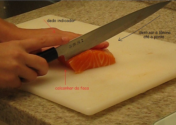 Cada corte deve iniciar com o calcanhar da lâmina da faca e, numa única passada, corta-se toda a fatia. Por isso, a lâmina deve ser longa (pelo menos 25cm).